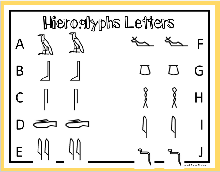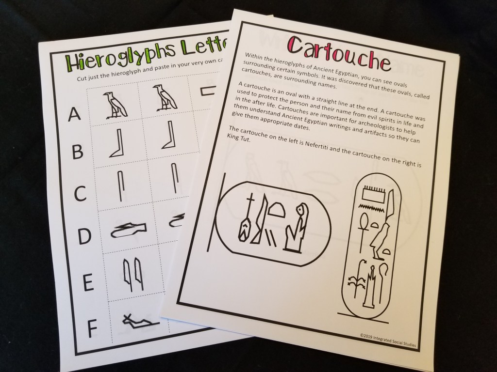 The paper version is included at the end of my Ancient Egypt Coloring Pages. The pages are short reads about some of the most iconic symbols and buildings in Ancient Egypt. At the end, students will cut the hieroglyphics for their name and paste them into a blank cartouche. Super fun.