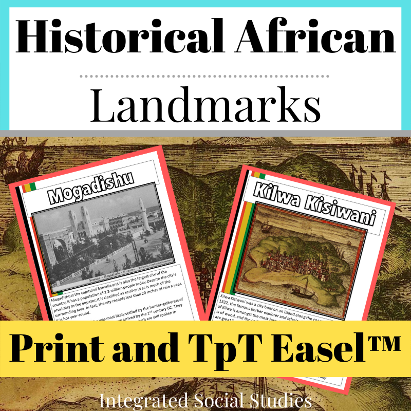 Historical African Landmarks focuses on the geography and history of Africa while celebrating the unique cultural heritage of many different time periods and kingdoms. Students can read more in-depth histories about the Great Zimbabwe, Kilwa Kisiwani, Jebel Barkal, and the University of Sankore. I also included a history about the ancient and modern city of Mogadishu.